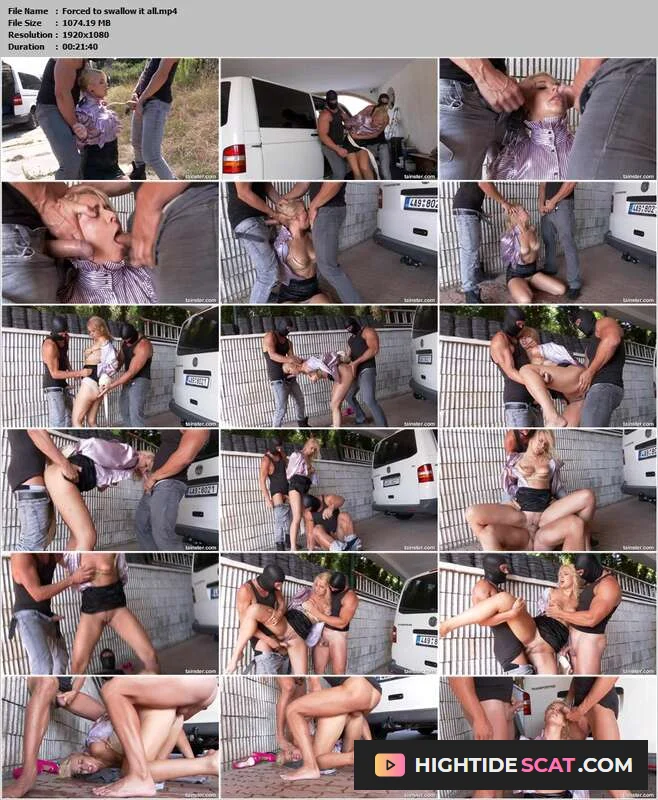 Description: When they find her walking on the road all alone they take their chance and take her with them. Forcing her on her knees they pee on her, then tie her up and take her to another location. There she is forced to suck their cocks and deeptroath them to the extreme. Then they fuck her hard and do everything they want with her. Finally they cum in her mouth and on her tits and make her swallow their cum and piss.